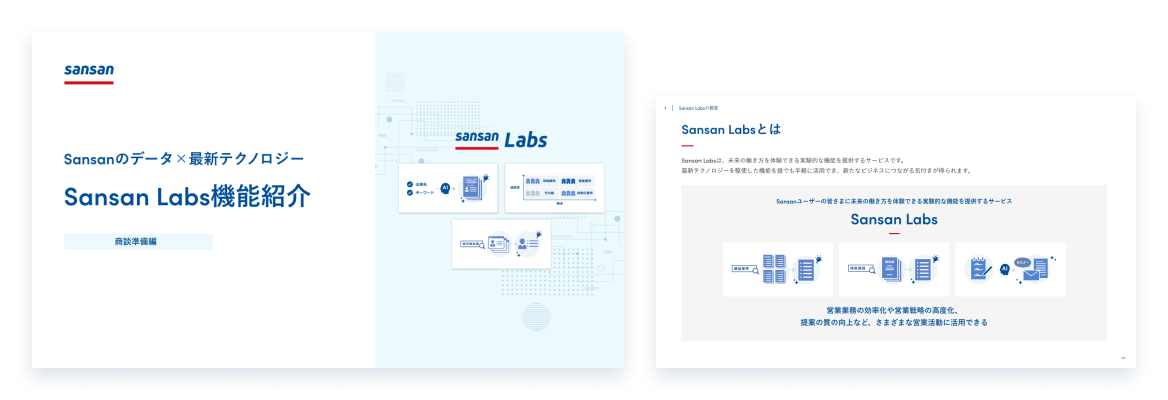 Sansan Labsは、未来の働き方を体験できる実験的な機能を提供するサービスです。ChatGPTを活用した「AI企業検索」や「5分で読める有価証券報告書」といった機能を紹介しています。
