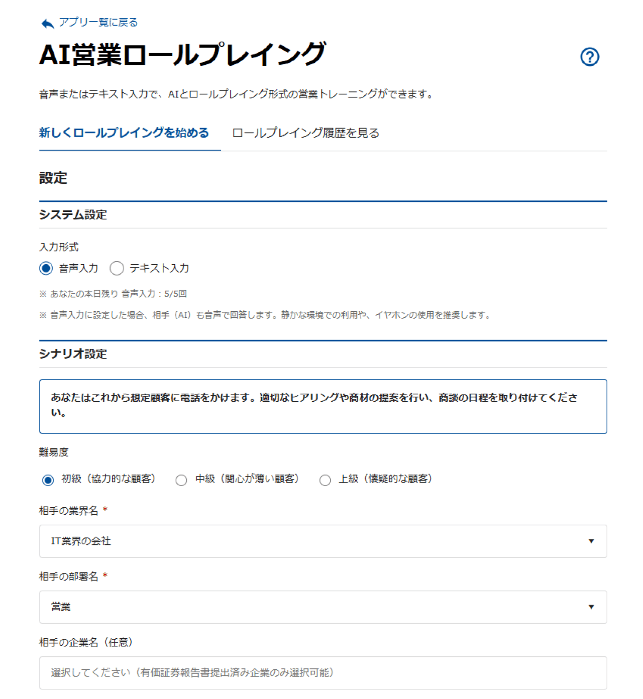 AI営業ロールプレイングにおいて、これまでのチャット形式に加え、音声での入力・出力が可能になりました。