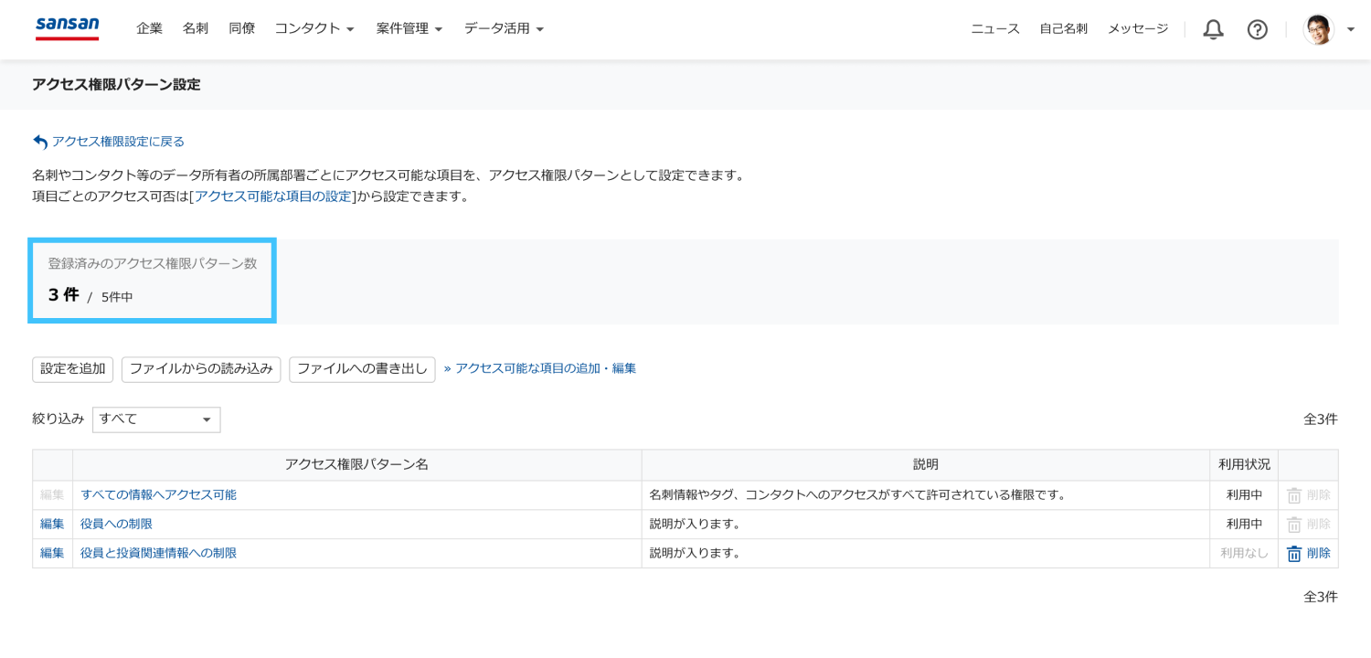 上限値は「アクセス権限パターン設定」の画面で確認できます。